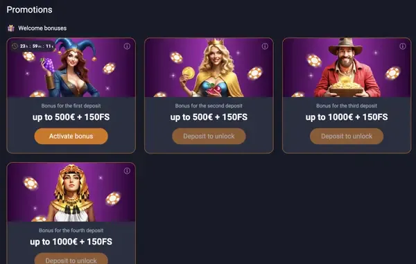 Our Welcome Pack on Vox Casino totals up to €3,000 + 600 Free Spins across four deposits. Deposit 1 gives 100% up to €500 + 150 Free Spins (min €20). Deposit 2 gives 125% up to €500 + 150 Free Spins (min €20). Deposit 3 gives 150% up to €1,000 + 150 Free Spins (min €25), and Deposit 4 repeats 150% up to €1,000 + 150 Free Spins (min €25). Wagering is 45x the bonus amount, and we do not require a promo code for the standard Vox bonus.